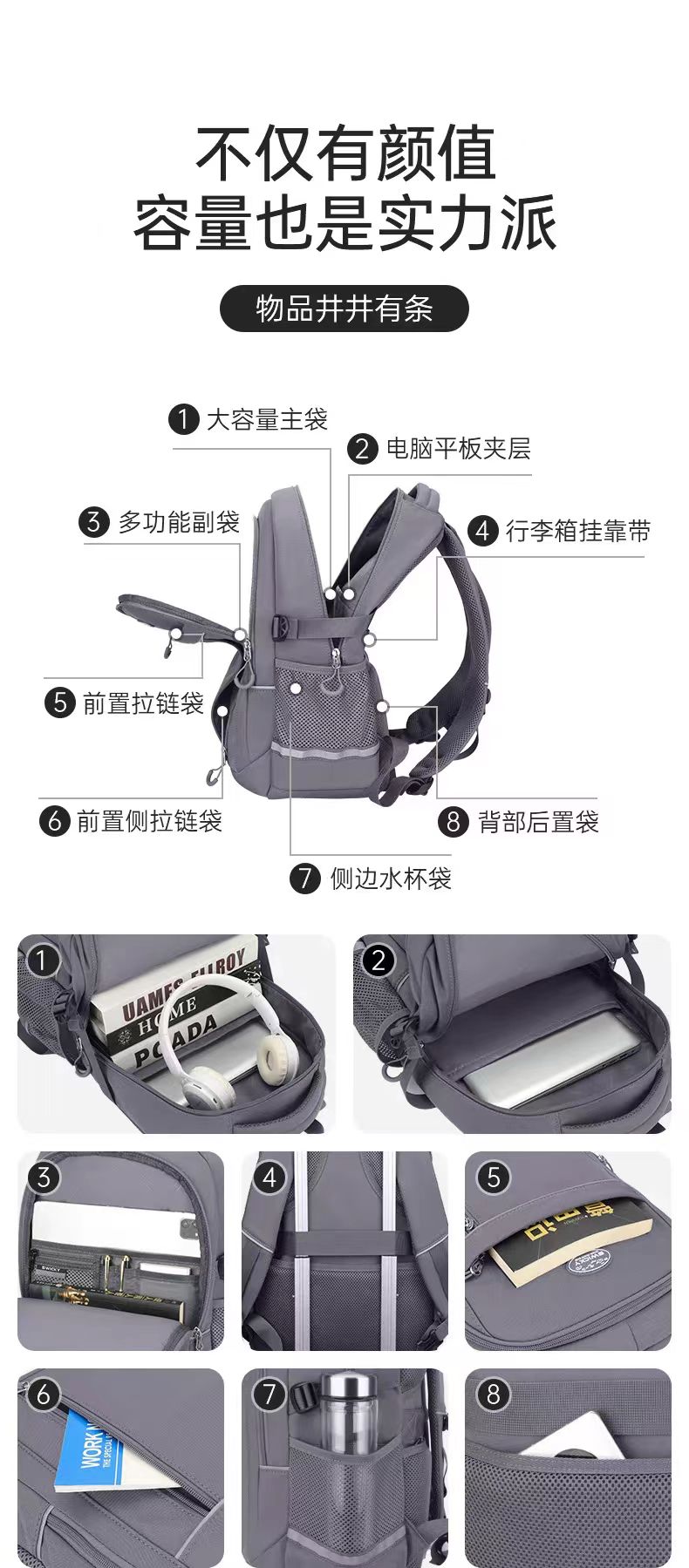 5.文具收纳组,大容量衣物主袋,多隔层设计,兼具功能于时尚.